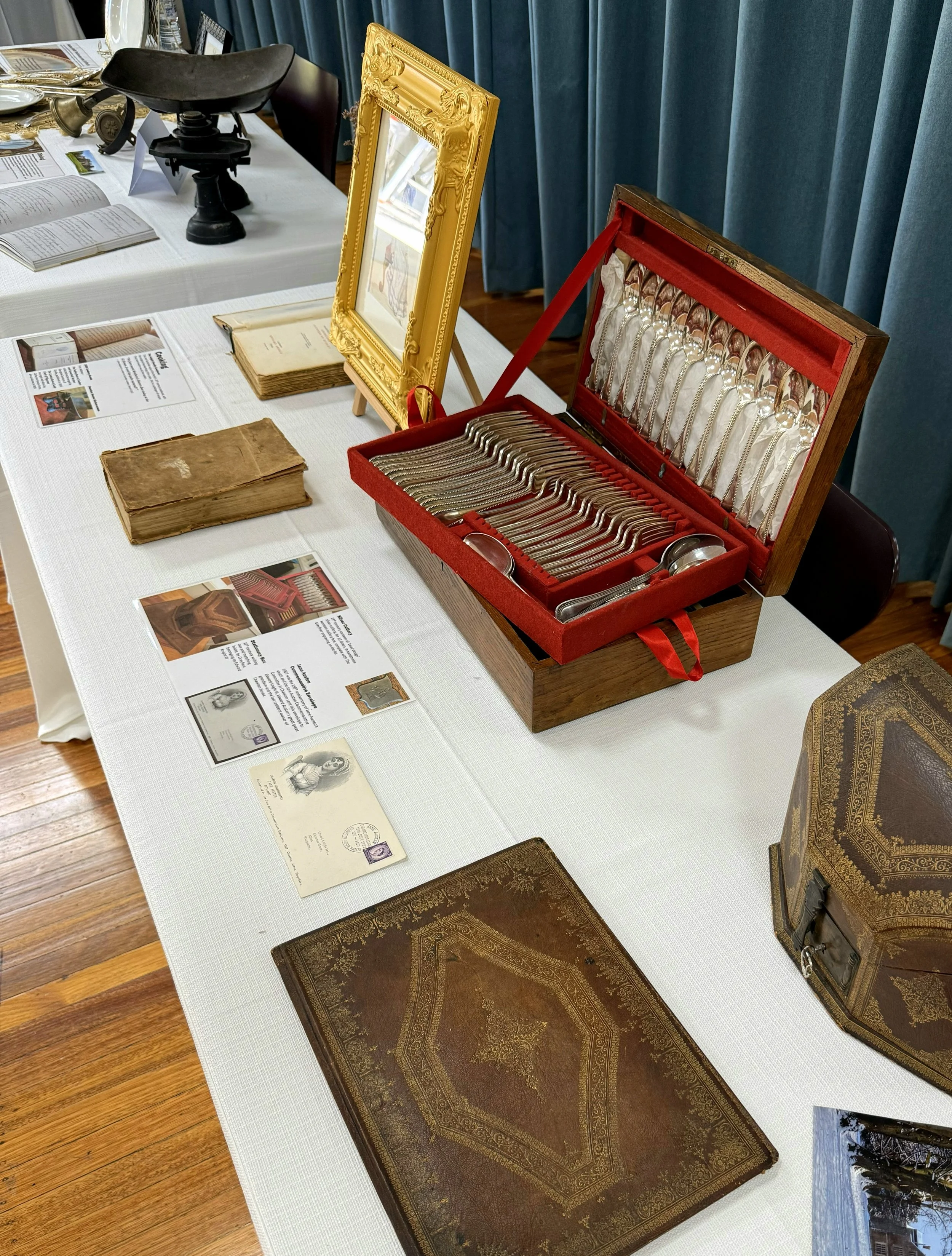 ✓ Artifact displays - Audiences can view authentic Regency fashion, 19th-century Pride and Prejudice editions, and family heirlooms up close (before or after the presentation)